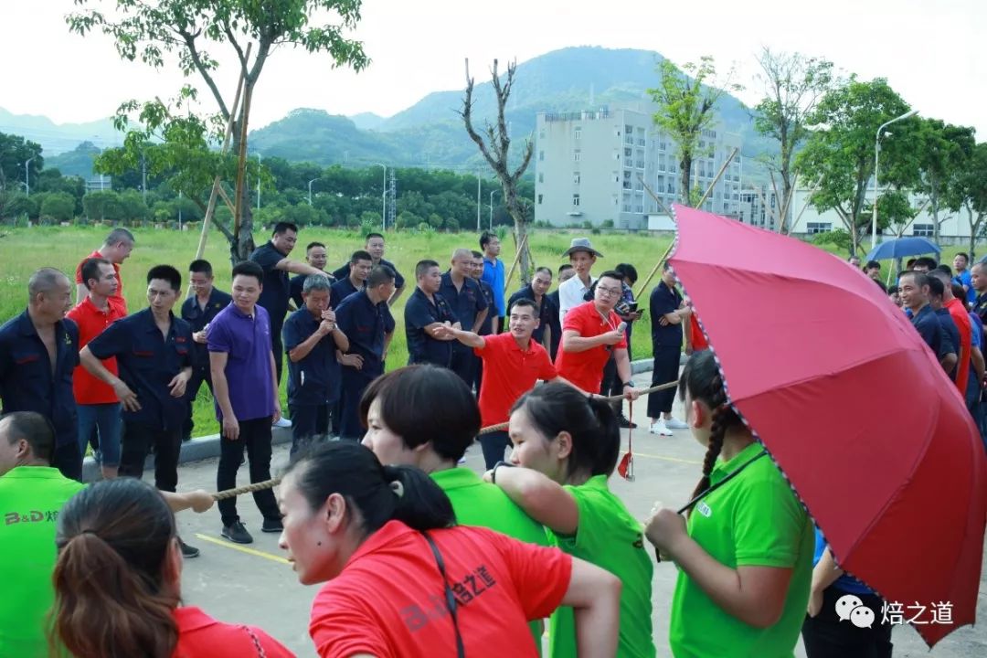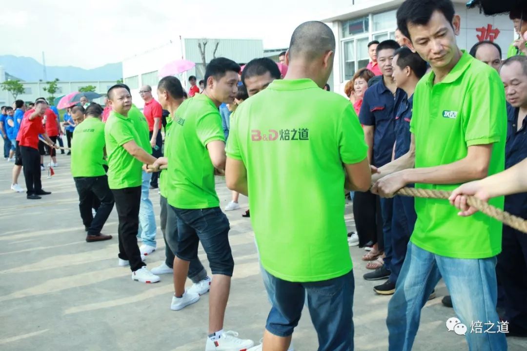 第一项活动,拔河比赛。比赛队伍分别有:焙之道食品事业部、金钥匙机械事业部、典范器具事业部、吉鲜生物科技事业部。